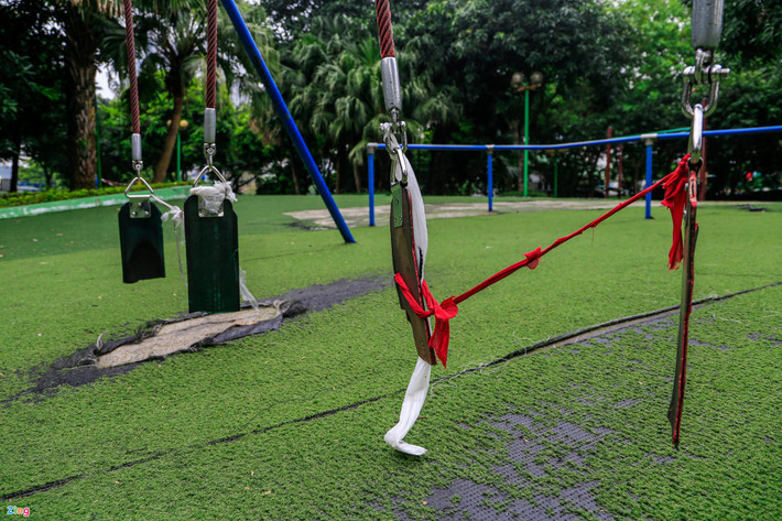 Nhiều hạng mục xuống cấp, dụng cụ dành cho trẻ em bị đứt dây, mất ốc. Ghế ngồi xích đu bị gãy làm đôi và hiện nối tạm bợ bằng các sợi dây dù.