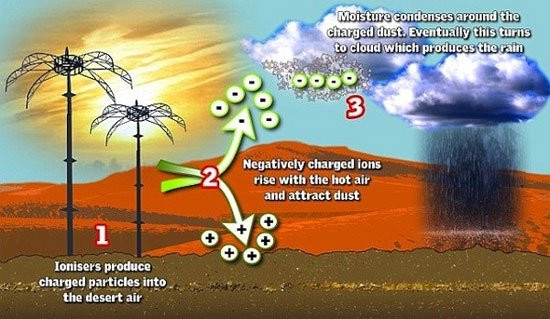 Thiết bị này sẽ phát ra các dòng điện tích trên một vùng rộng lớn, các ion dương sẽ “chìm” xuống mặt đất trong khi các Ion âm sẽ mang theo các hạt bụi trong không khí và “bay” lên tầng trên. Các hạt vật chất bay lên sẽ ngưng tụ lại tạo thành một vùng mây lớn, dần dần tích tụ hơi ẩm và tạo mưa.