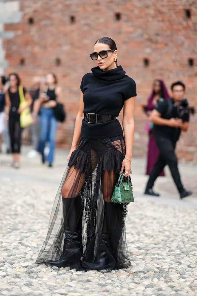 Váy xuyên thấu là cơ hội tuyệt vời để khoe đôi bốt cao bồi da yêu thích. Hãy dám diện một chiếc váy phủ vải tuyn mỏng và đôi bốt da đen mềm mại để có một vẻ ngoài vừa tạo nên sự thanh lịch vừa ấn tượng.