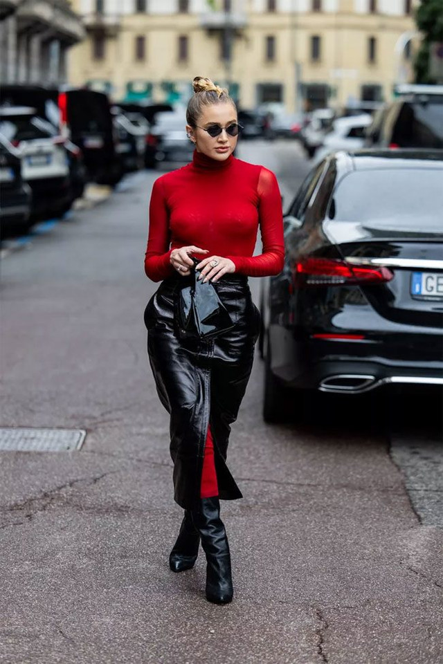 Một chiếc váy midi bằng cao su vừa vặn tạo cảm giác sắc sảo khi kết hợp với một đôi bốt da Chelsea. Hãy chọn một chiếc váy cao su có cạp cao với một chút ở phía trước kết thúc ngay phía trên mắt cá chân để tôn lên vẻ đẹp của đôi bốt.