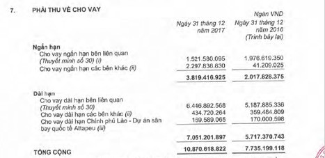 Trong báo cáo hợp nhất chưa qua kiểm toán thì kết thúc năm 2017, tổng các khoản phải thu của HAGL là hơn 16.347 tỷ đồng chiếm 30,6% giá trị tổng tài sản và tăng hơn 3.252 tỷ đồng so với cuối năm 2016 .