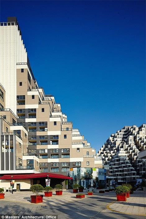 Có kiến trúc giống kim tự tháp, tòa chung cư 18 tầng ở Côn Sơn (Trung Quốc) đã thu hút sự chú ý của nhiều người. Nhìn từ trên cao, công trình giống như một khối lego xếp chồng lên nhau mỗi góc 45 độ. Kiến trúc sư của công trình này cho biết ông đã lấy cảm hứng từ ruộng bậc thang truyền thống ở Trung Quốc và môn thể thao parkour để hình thành nên tòa nhà. Ảnh:Daily Mail.