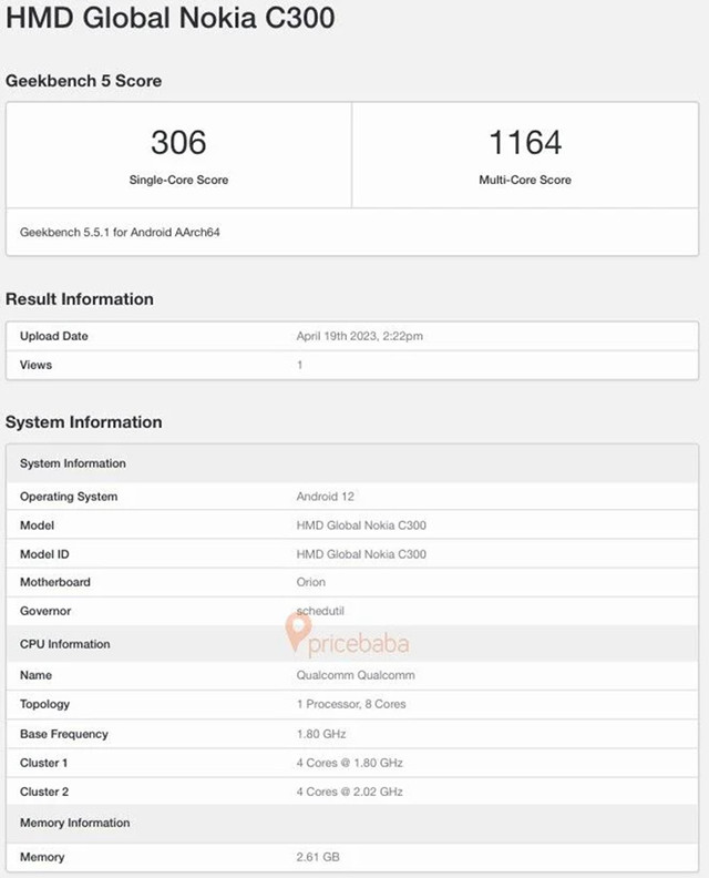 Theo đó, sản phẩm đã được phát hiện trên phép đo điểm chuẩn Geekbench với biệt danh “HMD Global Nokia C300”, trong đó HMD Global là công ty đứng sau smartphone Nokia hiện nay. Thiết bị được liệt kê với RAM 3 GB và chạy hệ điều hành Android 12.
