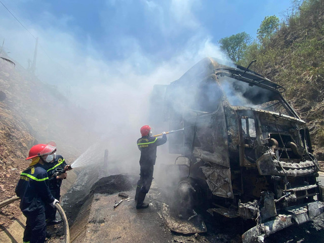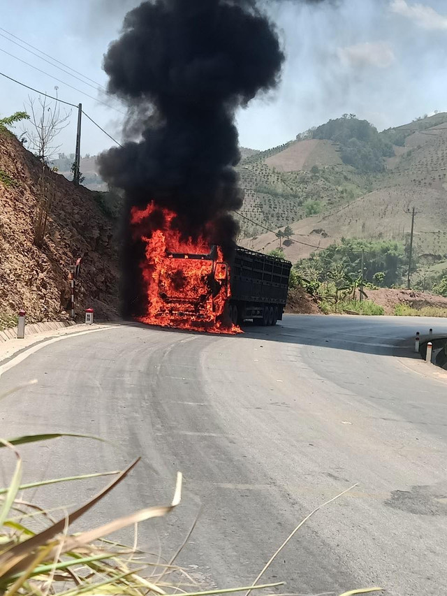 Ô tô đầu kéo bốc cháy dữ dội trên đường.