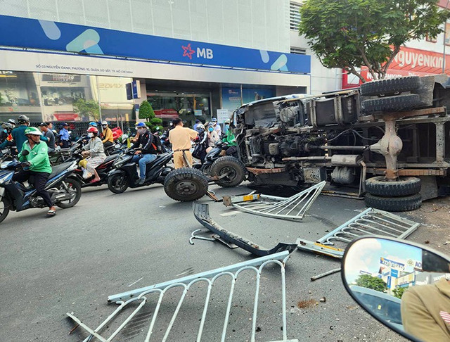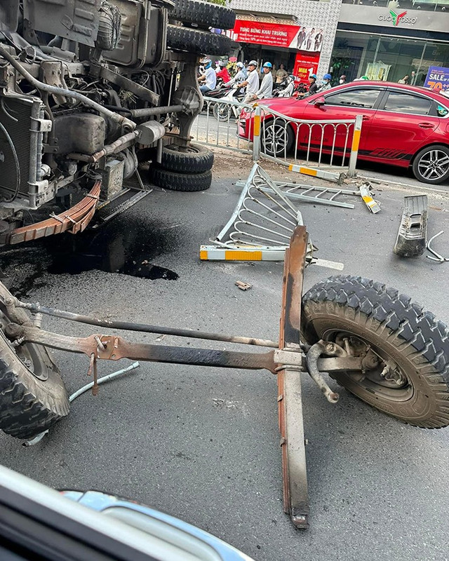 Tại hiện trường, xe tải nằm đè lên xe máy, phần trục bánh trước xe tải bị gãy rời, một đoạn dải phân cách bằng thép bị tông sập.