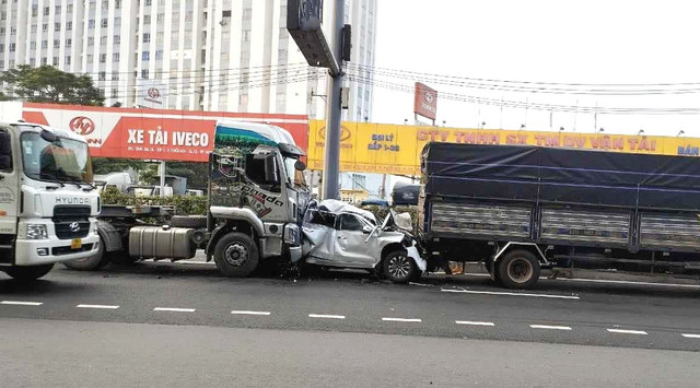 Ô tô con bị bẹp dúm, mắc kẹt giữa xe tải và xe đầu kéo