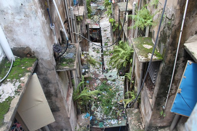 Khoảng trống giữa các lô chung cư bị người dân trưng dụng làm nơi chứa rác (chung cư Vĩnh Hội, quận 4).