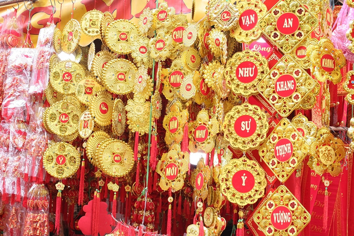 Khảo sát của PV cho thấy, các mặt hàng dây treo đèn lồng ở phố Hàng Mã được bán với giá từ 15 nghìn đồng/dây; dây trang trí viết chữ chúc mừng năm mới, vạn sự như ý… được bán 3 nghìn đồng/dây nhỏ; câu đối cao 80cm bán 220 nghìn đồng/đôi; đèn lồng từ 200 – 600 nghìn đồng/chiếc…
