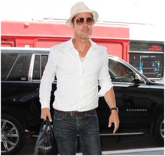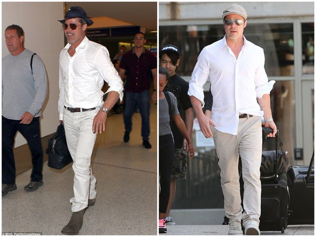 Dù còn trẻ hay đã bước sang tuổi trung niên, Brad Pitt vẫn trung thành cách mix áo sơ mi trắng với quần sáng màu. Ngoài ra, nam tài tử còn thay đổi kiểu mũ linh hoạt để trông quyến rũ, phong trần hơn. Kính râm, thắt lưng và đồng hồ tiếp tục là những phụ kiện không thể thiếu của ngôi sao hàng đầu này.