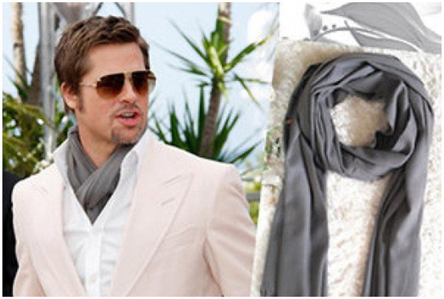 Brad Pitt cũng có một sự phá cách ấn tượng với áo sơ mi khi kết hợp nó cùng set đồ màu hồng nhạt và khăn quàng cổ màu xám. Cách mix đồ này giúp nam tài tử trông hấp dẫn và sành điệu lên rất nhiều, thể hiện sự phóng khoáng và hào hoa.