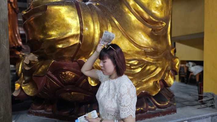 Một người phụ nữ quệt tiền lên tượng Phật lớn trong chùa Tranh.