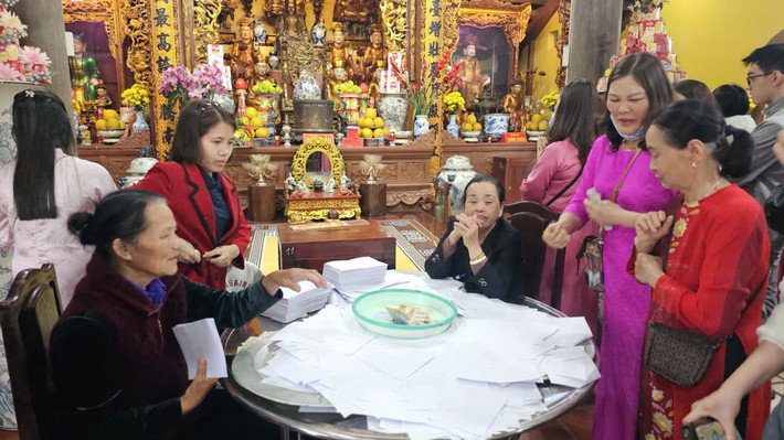 Ngay dưới ban thờ trong chùa, một nhóm phụ nữ bày bộ quẻ thẻ kèm một chiếc khay để du khách bỏ tiền, rút quẻ.