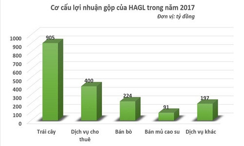 Sau khi trừ đi giá vốn hàng bán thì lợi nhuận gộp của Tập đoàn Hoàng Anh Gia Lai như sau: từ trái cây khoảng 905 tỷ đồng, từ bán bò khoảng hơn 200 tỷ đồng, bán căn hộ âm khoảng 1 tỷ đồng, các sản phẩm ngành đường âm khoảng 40 tỷ đồng, mủ cao su khoảng 56 tỷ đồng…