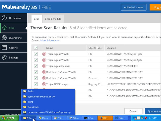 Tiếp tục thử nghiệm, Eric Parker cài đặt Malwarebytes trên máy XP và phát hiện tổng cộng 8 virus thuộc các loại Trojan, backdoor, trình thay đổi DNS và phần mềm quảng cáo. Tuy nhiên, vẫn còn nhiều virus khác ẩn náu trong hệ thống mà phiên bản miễn phí của Malwarebytes không thể phát hiện.