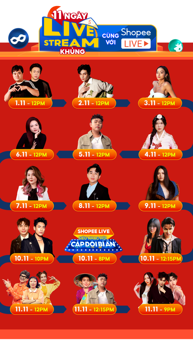 Chương trình “Shopee Live 11.11 Siêu Nhạc Hội - Cặp Đôi Bí Ẩn” phát sóng lúc 20H30 ngày 10.11, trên các kênh truyền hình và Shopee Live. Với sự góp mặt của dàn sao khủng gồm Văn Mai Hương, Chi Pu, Lân Nhã, Mai Tiến Dũng, Erik, Mỹ Anh cùng khách mời Quốc Thiên và 2 MC Hữu Đằng, Khả Như.