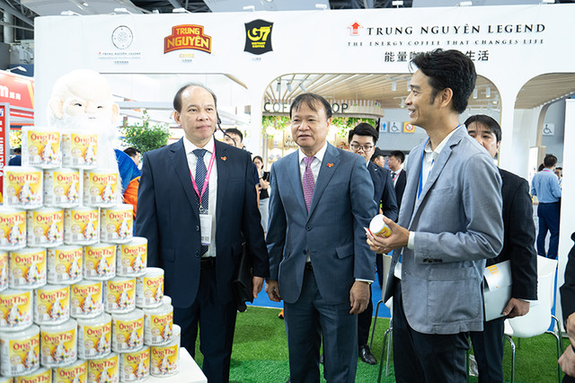 Thứ trưởng Bộ Công thương Đỗ Thắng Hải (đứng giữa) thăm quan gian hàng của Vinamilk tại hội chợ quốc tế Quảng Châu
