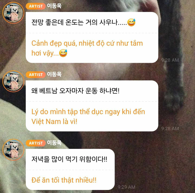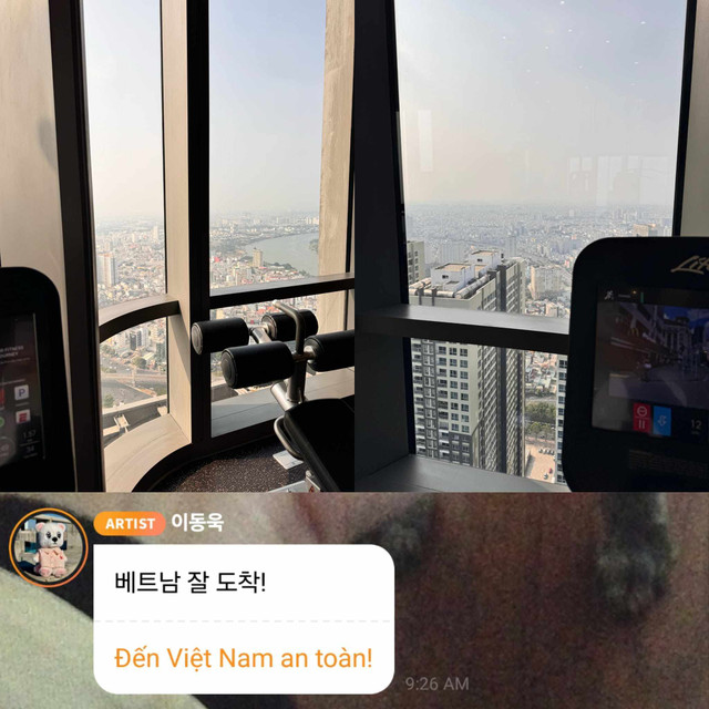 Ngay sau khi có mặt ở khách sạn, Lee Dong Wook đã nhanh chóng vào phòng tập gym. Anh chia sẻ hình ảnh chụp tại phòng tập, kèm theo những status vui vẻ khi nói về thời tiết nóng nực và lý do phải tập luyện luôn vì muốn ăn tối được nhiều.