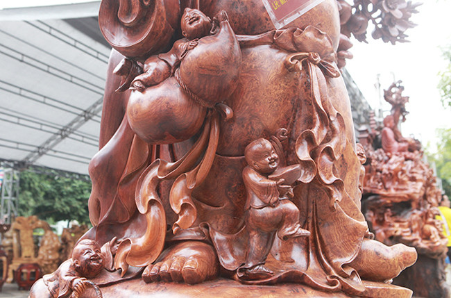 Đầu tiên là tác phẩm có tên Thập Bát La Hán, anh Trần Ngọc Biển (Thái Nguyên), chủ nhân của ba tác phẩm cho biết, 80% tác phẩm này được làm từ một gốc cây nu hương đỏ Gia Lai, rất quý hiếm. Hiện, tác phẩm được chào bán với giá 1,2 tỷ đồng.