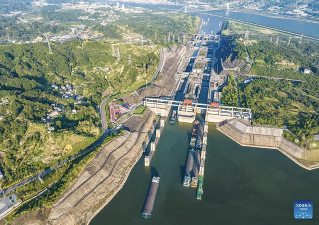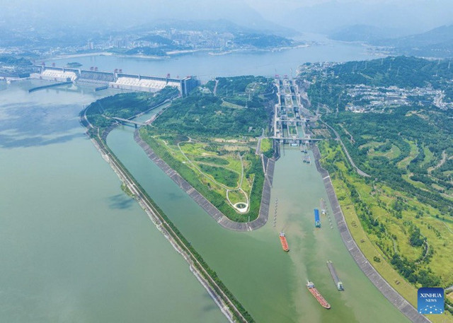 Tàu thuyền đi qua âu tàu ở đập Tam Hiệp, đập thuỷ điện lớn nhất thế giới. Ảnh: Tân Hoa Xã.