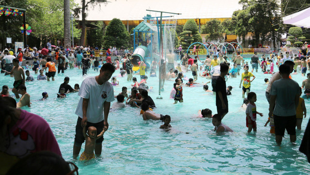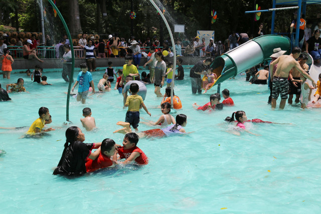 Khu vực bể bơi luôn trong tình trạng đông đúc, cả người lớn, trẻ nhỏ đều hào hứng vui chơi ở khu vực này dưới nắng trưa gay gắt.