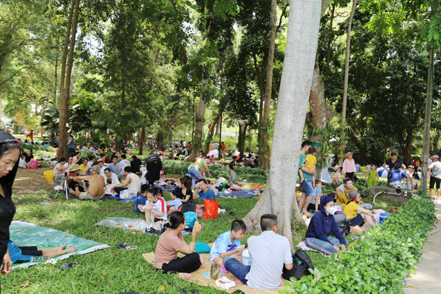Người dân ngồi nghỉ mệt, ăn uống dưới các tán cây cổ thụ trong Thảo Cầm Viên