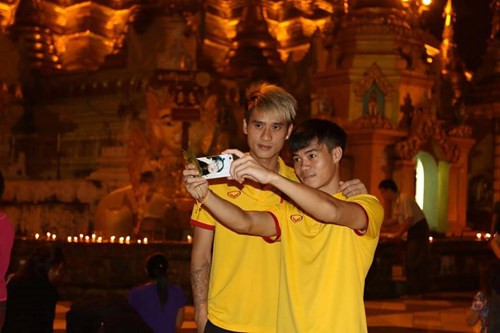 Viếng chùa Vàng, HLV Nguyễn Hữu Thắng và các học trò cầu mong bình an cho những người thân và những điều may mắn sẽ đến với đội tuyển Việt Nam khi dự AFF Cup 2016.