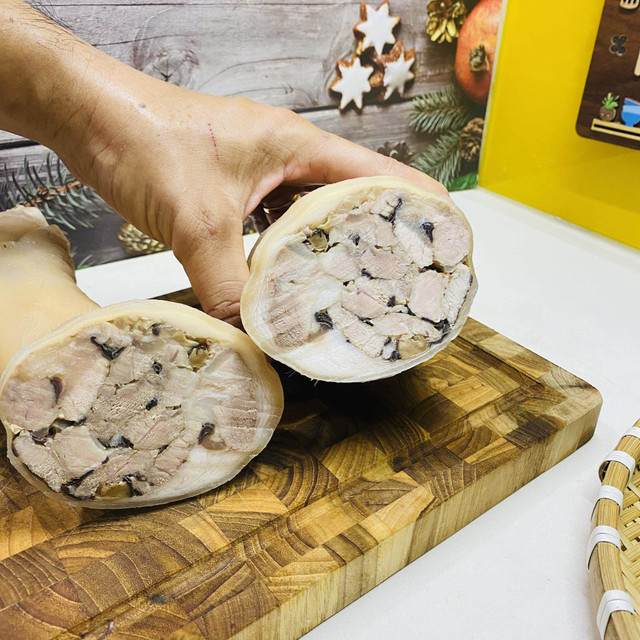 Chân giò rút xương nhồi thịt có lớp da dai ngọt bao bọc phần nhân thịt nhồi đậm đà, thơm mềm rất hấp dẫn.