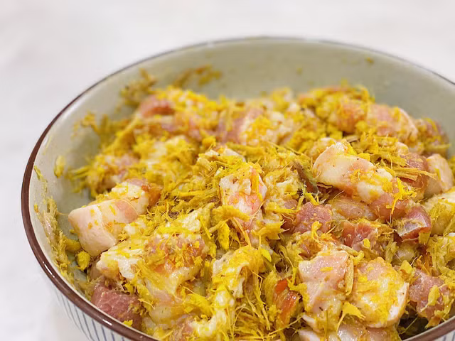 - Thái thịt thành những miếng vừa ăn, trộn đều thịt với tất cả các gia vị đã chuẩn bị sẵn.
