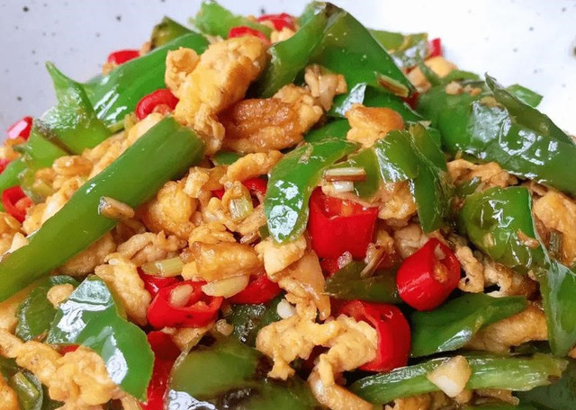 Bước 2: Cho ớt xanh và ớt đỏ vào xào một lúc, dùng thìa ấn ớt cho bớt nước và tăng hương vị, rồi cho ra khỏi chảo, đặt sang một bên.