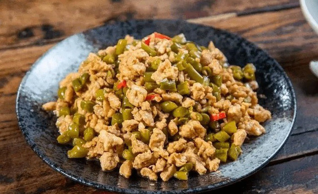 Bước 1: Đậu muối chua cắt thành những khúc nhỏ. Ớt, gừng, tỏi băm nhuyễn. Thịt thêm muối, nước tương nhạt, bột mì và dầu ăn vào trộn đều, ướp trong 10 phút.