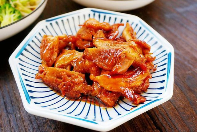 Đổ xốt teriyaki vào, vặn lửa vừa, dùng thìa múc liên tục nước sốt rưới lên thịt gà. Nấu cho tới khi thấy nước xốt cạn sệt lại là được. Đợi miếng gà nguội, cắt thành miếng nhỏ vừa ăn.