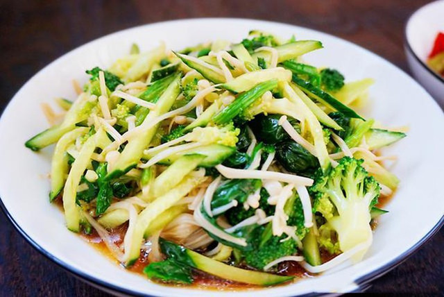 Sơ chế bông cải xanh, nấm kim châm, cải bó xôi, dưa chuột rửa sạch, để ráo nước. Đun sôi nước, cho lần lượt các nguyên liệu (trừ dưa chuột) vào chần sơ qua. Cách này giúp nấm chín và loại bỏ axit oxalic trong cải bó xôi. Cắt nhỏ các nguyên liệu cho vừa ăn.