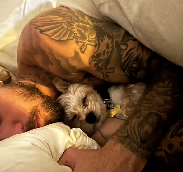 Nữ người mẫu còn đăng tải ảnh chụp ông xã nằm trên giường bên cạnh chú cún cưng