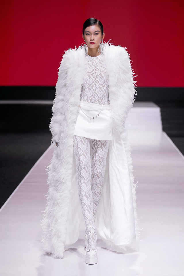 Show thời trang "Timeless" với 115 thiết kế, gồm 3 màn diễn, kể lại 3 câu chuyện dịch chuyển của vòng lặp xu hướng thời trang. Thanh Hằng giữ vị trí vedette cho bộ sưu tập. Chân dài gạo cội tạo dáng trên bục sân khấu trong bộ đầm high-low phủ kín hoa lụa thủ công, khoe cặp chân dài đắt giá.