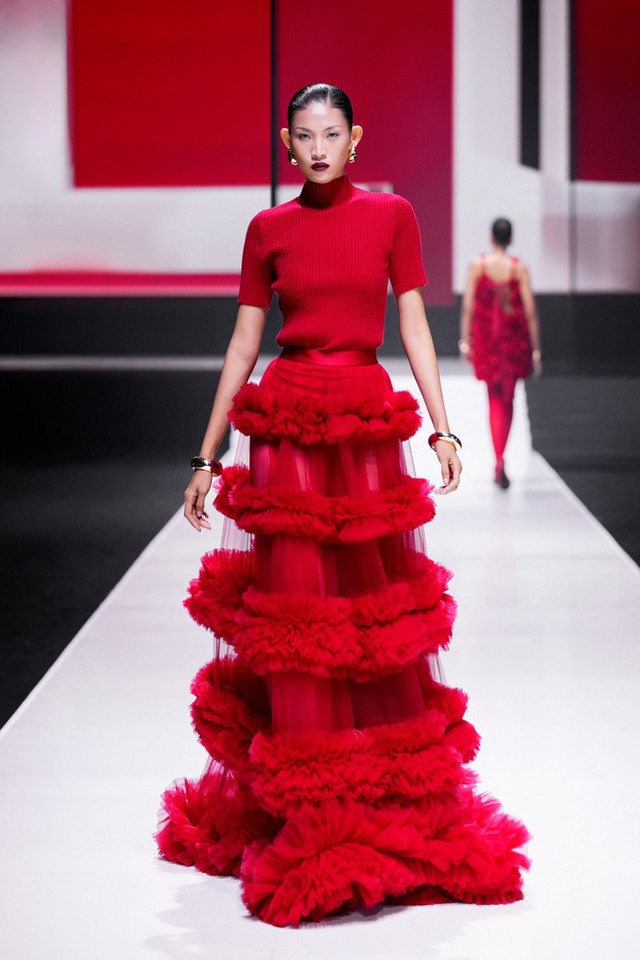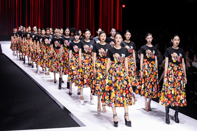 Kết màn ấn tượng với những người mẫu phối áo phông với chân váy hoa đồng họa tiết, tạo cảm giác đồng bộ, hấp dẫn về mặt thị giác.