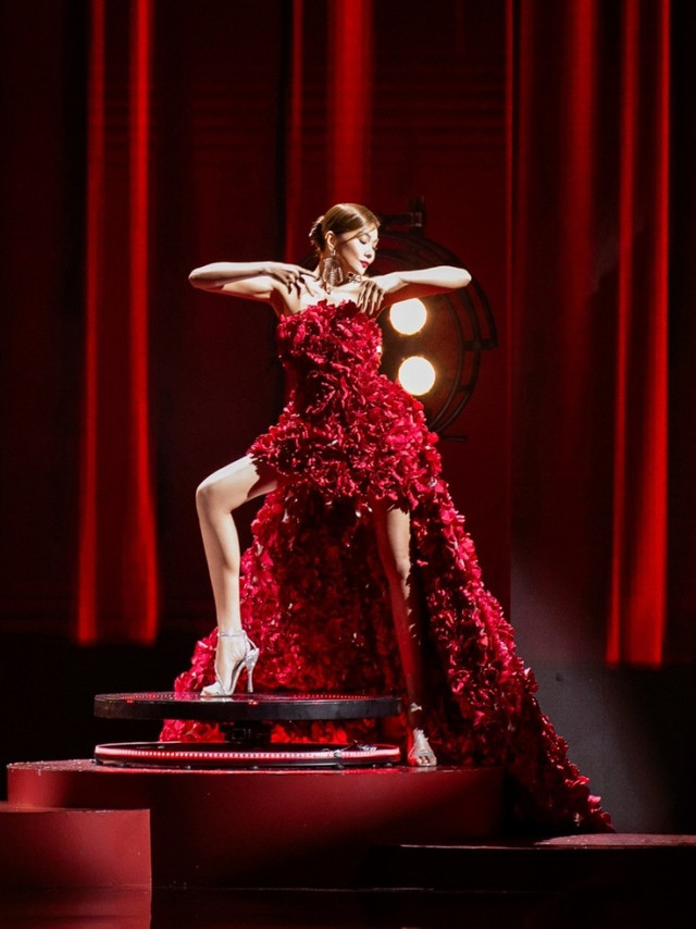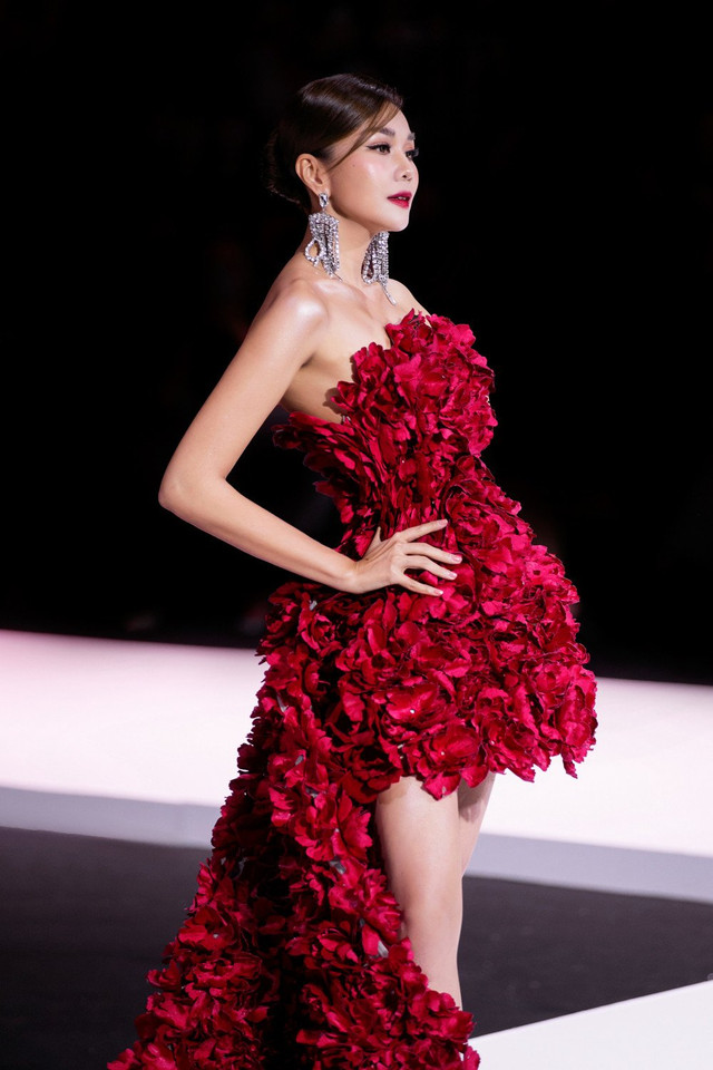 Bộ đầm hơn 1.000 bông hoa bằng vải dày và cứng trên khung corset kim loại khiến thiết kế nặng. Dù là một siêu mẫu hàng đầu Việt Nam, Thanh Hằng cho biết vẫn mất vài chục phút để làm quen và tập luyện để di chuyển tự tin với bộ đầm lớn.