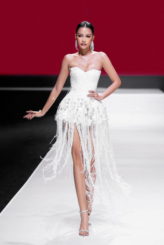 Hoa hậu Ngọc Châu khoe vẻ đẹp kiêu kỳ với đầm tua rua cúp ngực.