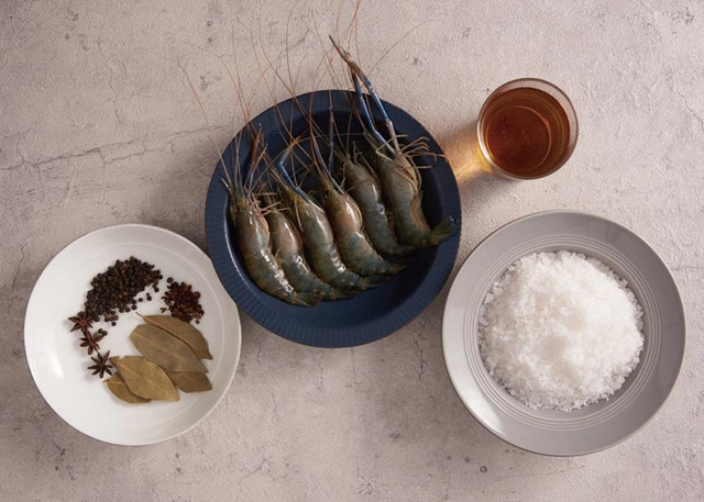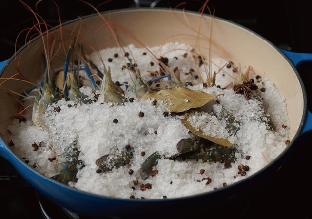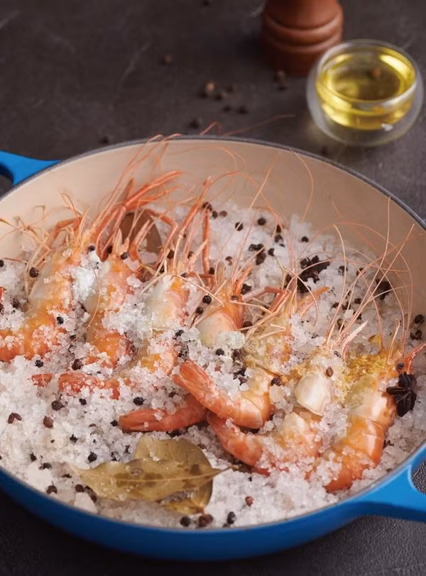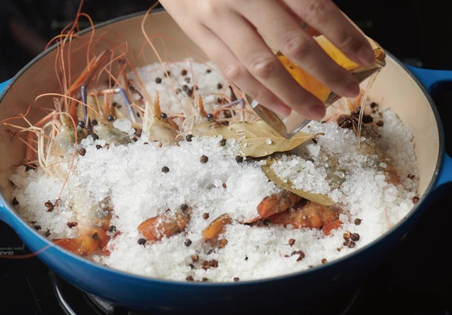 Bước 2: Xếp đều tôm lên phần muối trong chảo sau đó phủ lớp muối đã bỏ ra kín phần tôm đã xếp.