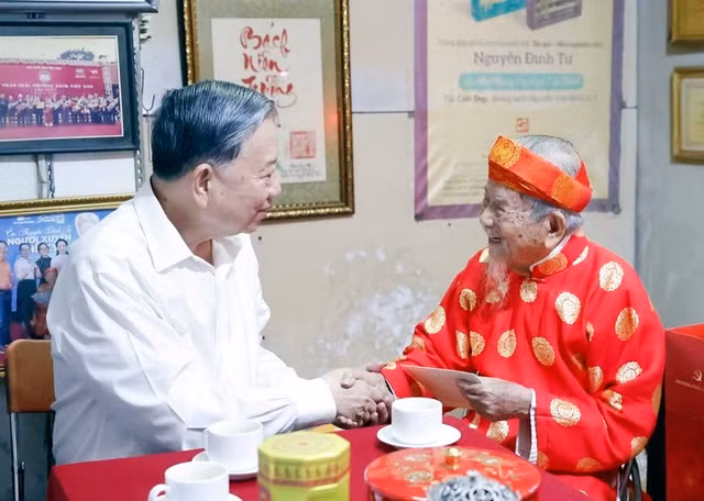 Tổng Bí thư Tô Lâm ân cần thăm hỏi sức khỏe, đời sống của nhà nghiên cứu Nguyễn Đình Tư và gia đình; bày tỏ sự trân trọng đối với những đóng góp quý báu của cụ trong lĩnh vực nghiên cứu, sưu tầm, góp phần giáo dục truyền thống cho thế hệ trẻ, làm giàu thêm đời sống văn hóa tinh thần của địa phương.