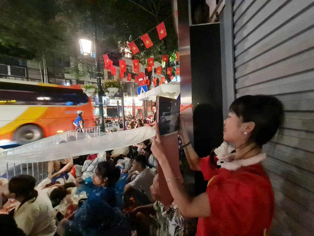 2h40: Sân vận động Mỹ Đình xuất hiện mưa nhỏ. Người dân đội mưa chờ đoàn xe xuất phát.