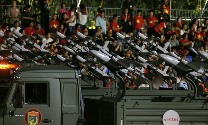 Đội hình luyện diễu binh tiến qua lễ đài của các khối bảo đảm khoảng cách, cự ly, tốc độ, động tác mạnh mẽ, thể hiện khí thế hào hùng, sức mạnh của lực lượng vũ trang.