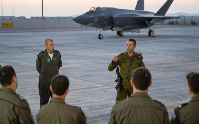 Tổng Tham mưu trưởng quân đội Israel, trung tướng Herzi Halevi (phải) phát biểu khi tới thăm căn cứ không quân Nevatim.