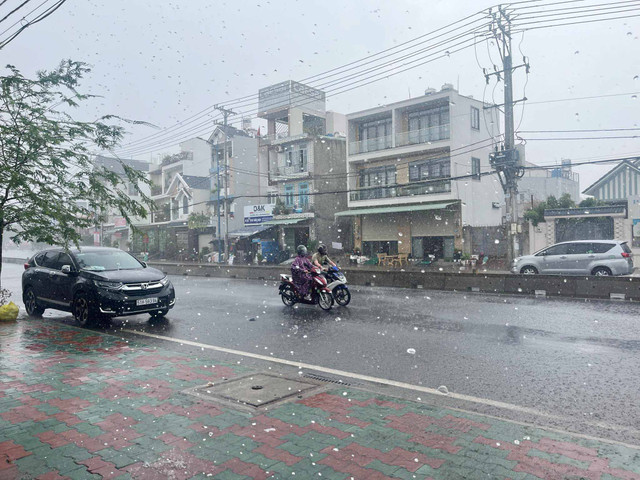 Mưa to trút xuống người đi đường phải tấp vào nhà dân trú mưa