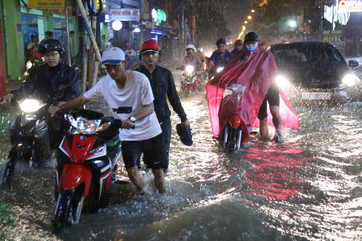 Đến 22h khuya cùng ngày, mưa vẫn như trút nước. Các tuyến đường ở TP. HCM chìm trong nước khiến người dân khổ sở trăm bề.