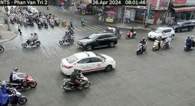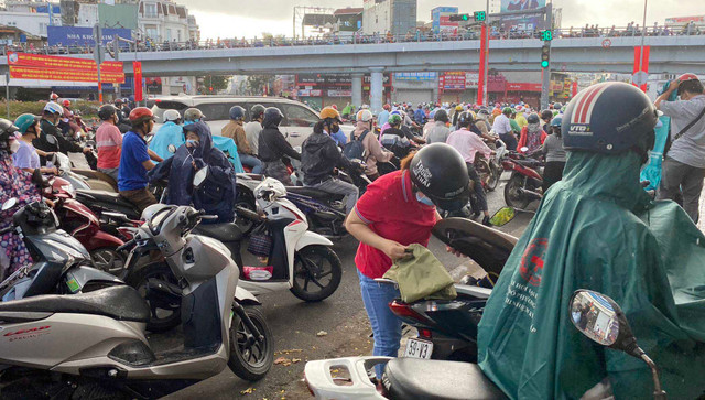Tại khu vực đường Quang Trung, Phan Văn Trị, Nguyễn Oanh (quận Gò Vấp), mưa bất chợt khiến người tham gia giao thông vội dừng xe bên đường để mặc áo mưa.