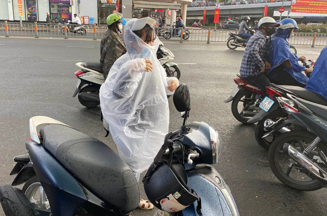 Vào khung giờ cao điểm, nhiều nơi có mưa nhẹ hạt khiến người đi đường khá bất ngờ, phải mặc áo mưa hoặc tấp xe vào lề đường trú tạm.