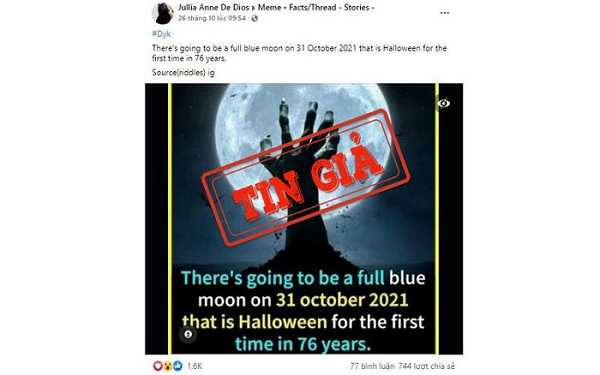 Tuy nhiên, hiện tượng Trăng xanh sẽ không xảy ra vào ngày 31/10/2021. Sự nhầm lẫn này có thể xuất phát từ hiện tượng Trăng xanh diễn ra ngày 31/10/2020. Đó cũng là lần đầu tiên trong 76 năm Trăng xanh xảy ra vào đêm Halloween.