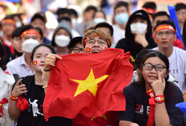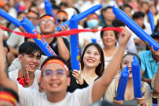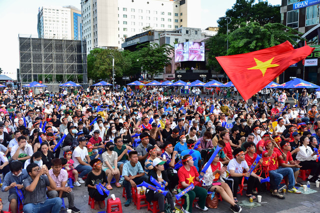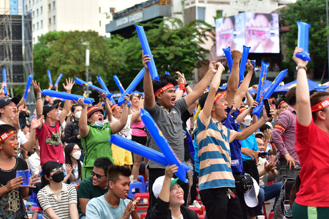 Chiều 13/5, hàng nghìn CĐV tập trung về phố đi bộ Nguyễn Huệ (quận 1, TP.HCM) theo dõi trận bán kết môn bóng đá nam SEA Games 32 giữa U22 Việt Nam và U22 Indonesia.