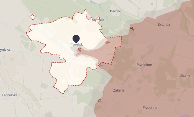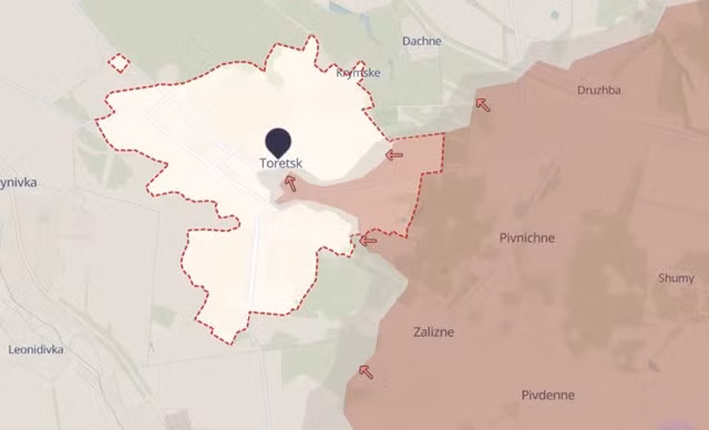 Nhóm phân tích DeepState cho biết, các khu dân cư ở vùng ngoại ô Toretsk đều đã thất thủ. Pivnichne, Zalizne, Druzhba và Pivdenne đều đang nằm dưới sự kiểm soát của Nga, DeepState cho biết.