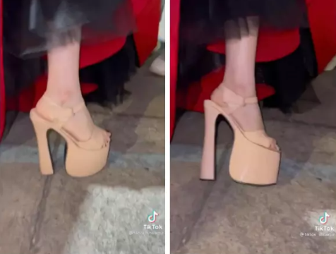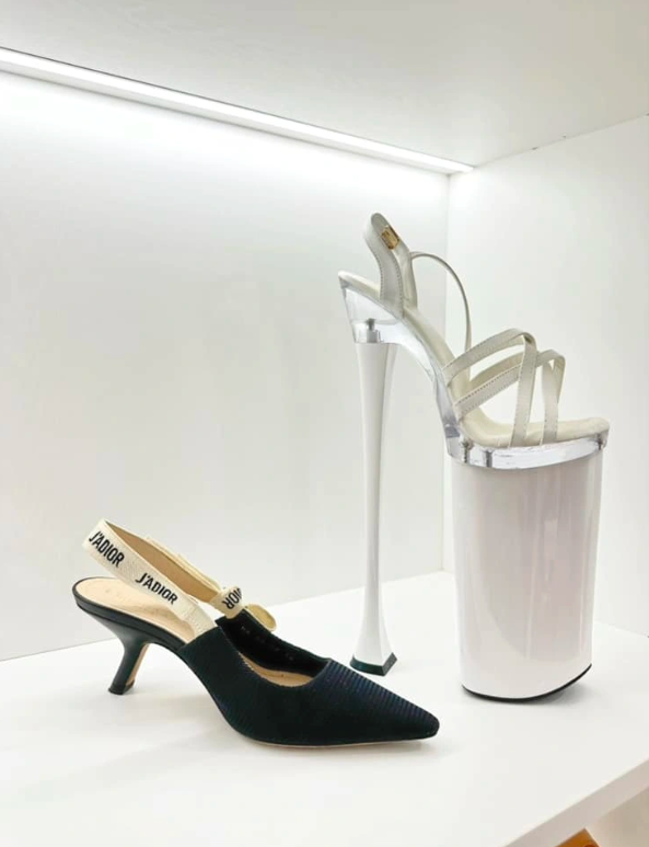 Đặt cạnh nhau hai đôi giày có độ khác biệt rất chênh lệch về phần gót giày đủ thấy lợi thế “ăn gian” chiều cao mà bảo bối của Hòa Minzy mang lại.